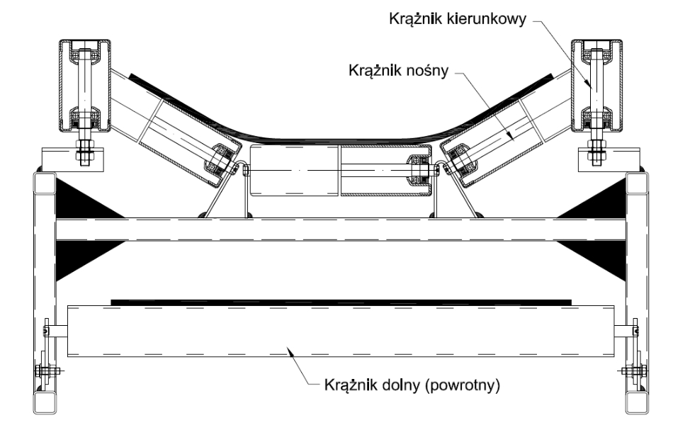 - Wspornik / rama: Sztywna konstrukcja stalowa, która trwale utrzymuje krążniki w ustalonej geometrii i jest mocowana do głównej ramy przenośnika.